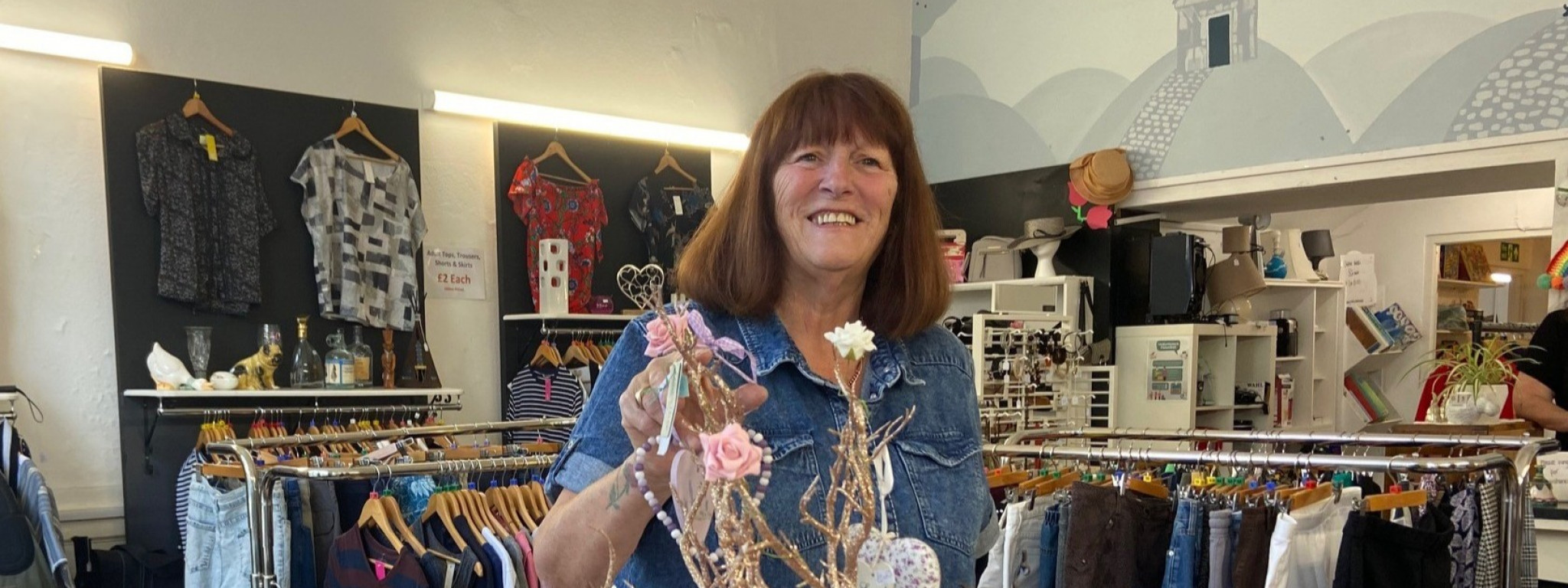 Sue volunteers in our Newton Abbot shop where her daughter Kathy is the manager. Sue started volunteering seven years ago and works there one day a week. She is one of many volunteers helping with a variety of tasks in the shop throughout the week. Her main responsibilities are working the till, sorting through donations, checking for Gift Aid, steaming clothes, sorting through storage boxes and putting items out on display, cleaning and pricing. There are also several students and young people who do placements in the shop and she has supported them over the years.